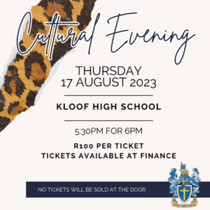 Cultural Evening – Tickets available Calendar Add to Calendar Add to Timely Calendar Add to Google Add to Outlook Add to Apple Calendar Add to other calendar Export to XML When: 17th August 2023 @ 5:30 pm 2023-08-17T17:30:00+02:00 2023-08-17T17:45:00+02:00 Where: Kloof High School Cost: R100